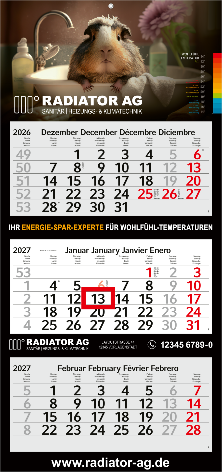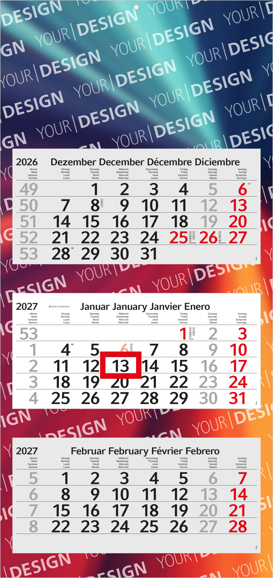 Der Profil 3 Bestseller ist ein preiswerter Mehrblock-3-Monatskalender, der durch seine großzügige Werbefläche und praktische Funktionen überzeugt. Mit einem viersprachigen Kalendarium, einer faltbaren Rückwand und hochwertigen Druckmöglichkeiten bietet er Unternehmen eine ideale Plattform für effektive Markenpräsentation. Hergestellt in Deutschland, kombiniert der Kalender Qualität, Funktionalität und Wirtschaftlichkeit.