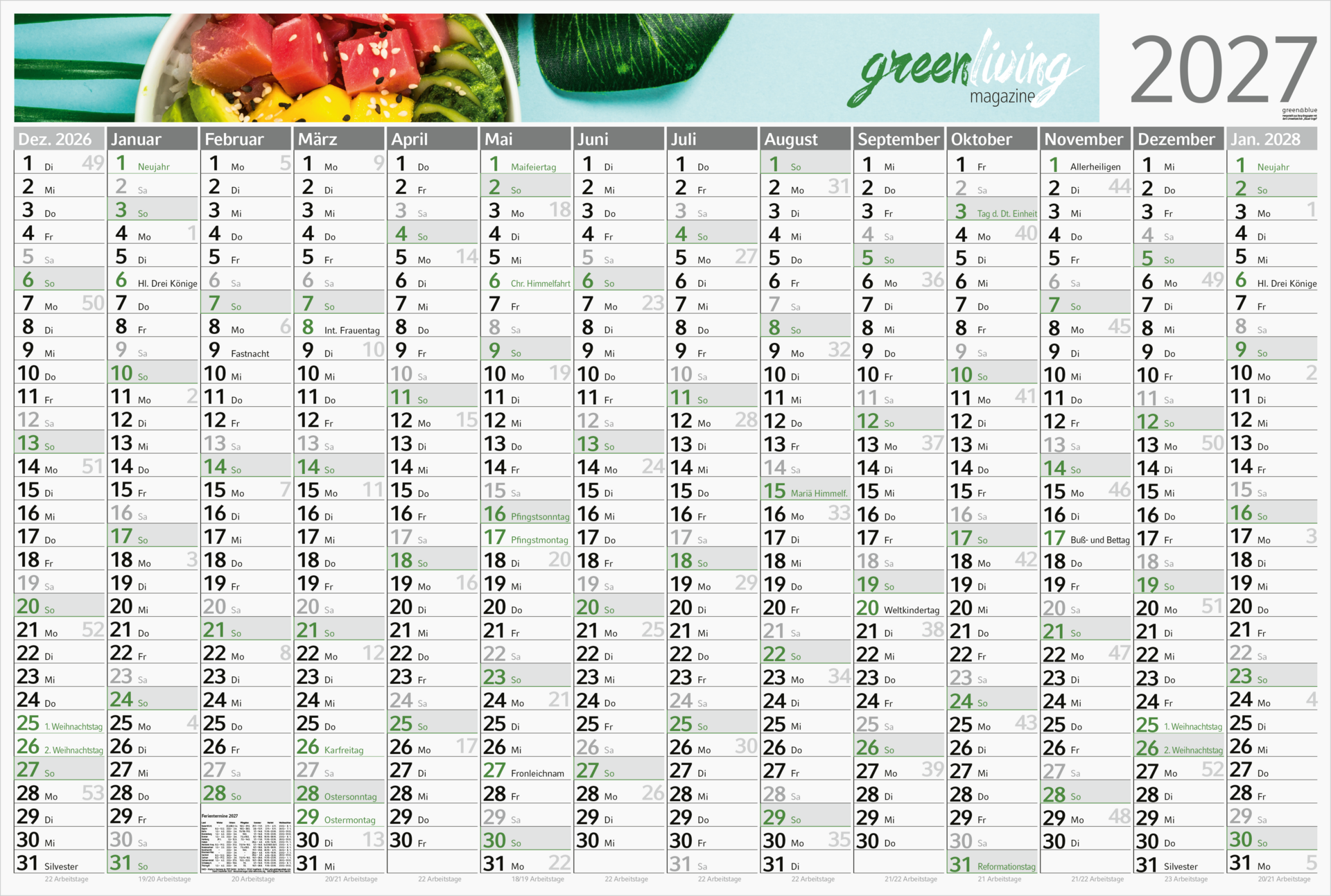 Der Wandplaner Horizont green+blue vereint klassische Funktionalität mit besonderer Umweltfreundlichkeit. Gefertigt aus Recyclingpapier, ausgezeichnet mit dem Umweltzeichen „Blauer Engel“, ist er die nachhaltige Wahl für Unternehmen. Das großzügige Format von 980 × 660 mm bietet viel Raum für eine übersichtliche Planung. Das 14-monatige Kalendarium (Dezember bis Januar) ist einsprachig in Deutsch und überzeugt durch seine farbliche Gestaltung, wobei Sonn- und Feiertage besonders hervorgehoben werden können. Eine individuell gestaltbare Werbefläche am Kopf des Planers macht ihn zu einem perfekten Werbemittel. Der hochwertige 4C-Druck ist inklusive. „Made in Germany“.