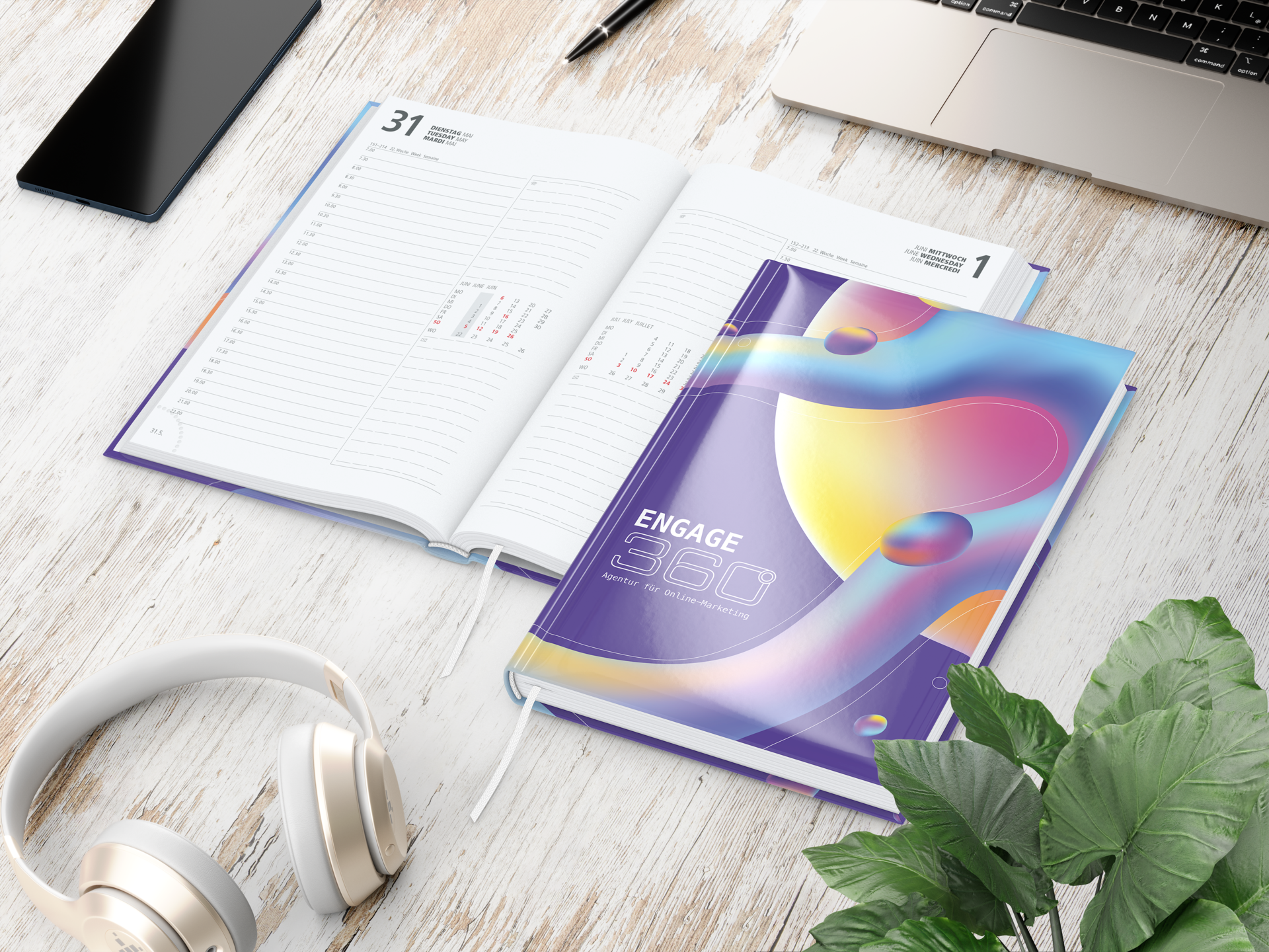 Der Buchkalender Image ist ein zeitloser Klassiker im DIN-A5-Format (148 × 210 mm), der sich durch Funktionalität und zahlreiche Individualisierungsmöglichkeiten auszeichnet. Mit 352 Seiten bietet er je Tag eine Seite für eine strukturierte Planung, ergänzt durch eine Halbstunden-Einteilung von 7 bis 22 Uhr und einen Informationsteil. Sonntage (und Feiertage) sind in Rot (HKS 14) hervorgehoben, und das Kalendarium ist mehrsprachig verfügbar. Der hochwertige Hardcover-Einband mit wattierter Buchdecke, rundem Rücken, Eckenperforation, Lesezeichen und Kapitalband sorgt für Langlebigkeit und Benutzerfreundlichkeit. Für den Einband stehen verschiedene Materialien und Veredelungsmöglichkeiten zur Wahl. „Made in Germany“.