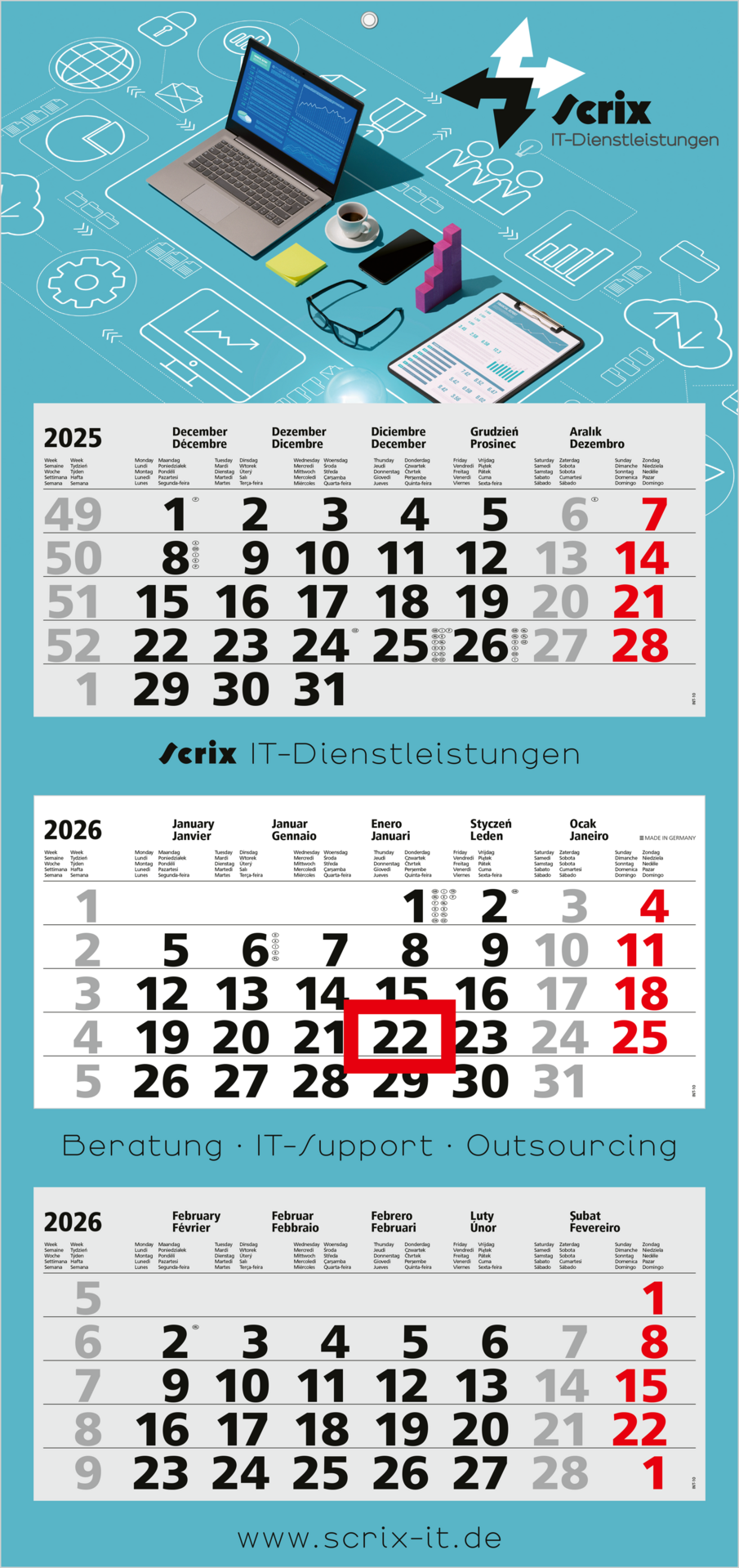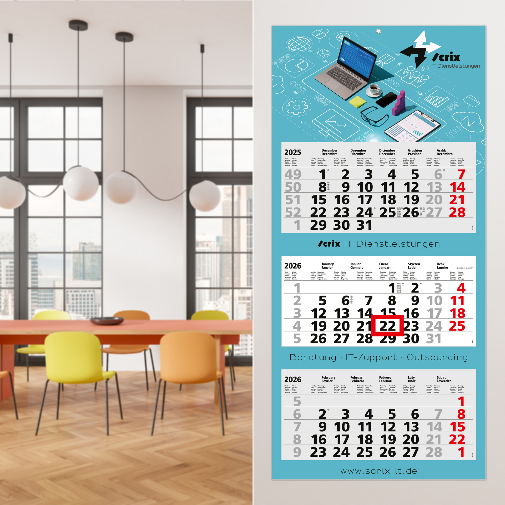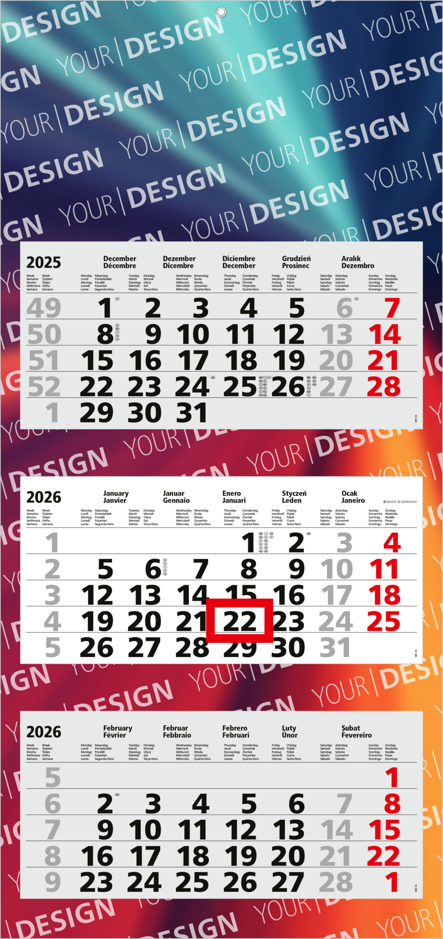 Der Maxi Light 3 ist ein vielseitiger 3-Monatskalender, der mit klassischem Design, Funktionalität und Werbewirksamkeit überzeugt. Mit einem klaren mehrsprachigen Kalendarium, einer komplett bedruckbaren Rückwand und hochwertigen Druckoptionen ist dieser Kalender eine effektive Plattform für Markenbotschaften. Ergänzende Sonderoptionen machen ihn flexibel an individuelle Anforderungen anpassbar. „Made in Germany“ – für Qualität und Zuverlässigkeit.