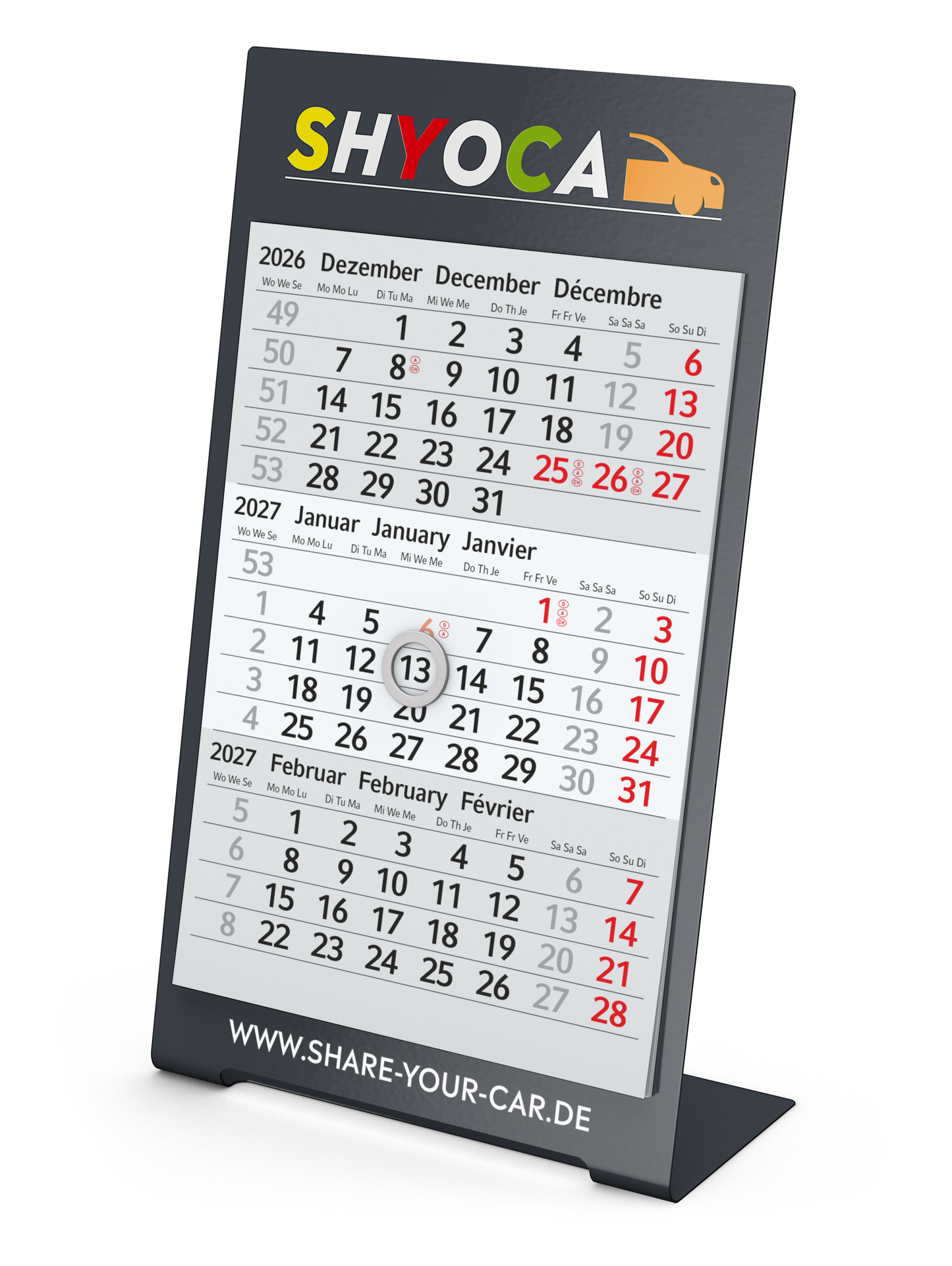 Der Desktop 3 Color bietet eine perfekte Kombination aus moderner Ästhetik und praktischer Handhabung. Mit seinem farbig pulverbeschichteten Metallaufsteller und dem magnetischen Kalenderblock ist er ein Design-Statement für jeden Schreibtisch. Dank individuell bedruckbarer Werbeflächen und hochwertiger Verarbeitung eignet er sich ideal als Werbemittel. „Made in Germany“, überzeugt der Kalender durch Präzision und Langlebigkeit.