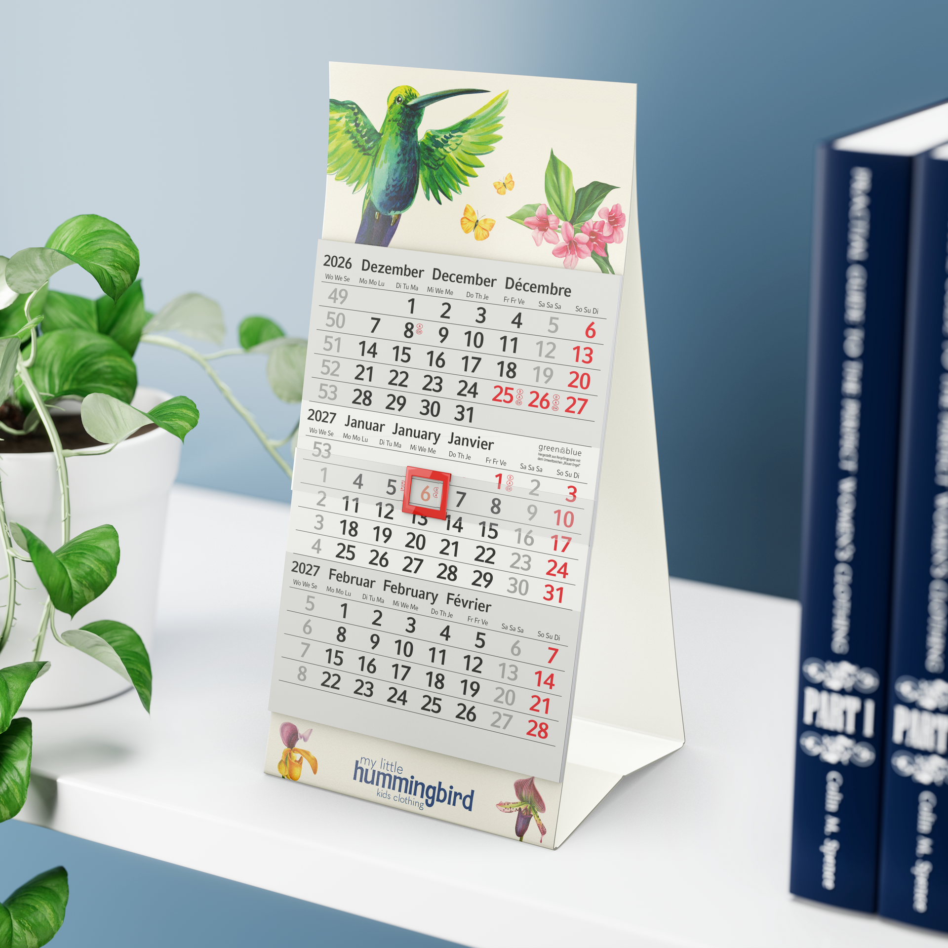 Der Mini 3 green+blue ist die Wahl für Unternehmen, die Wert auf Nachhaltigkeit legen. Dieser Tisch-Aufstellkalender kombiniert ein kompaktes Design mit hochwertigem Recyclingpapier, ausgezeichnet mit dem Umweltzeichen „Blauer Engel“. Mit zusätzlichen Werbeflächen und flexiblen Druckoptionen ist er ein vielseitiges und umweltfreundliches Werbemittel. „Made in Germany“ – nachhaltig und funktional.