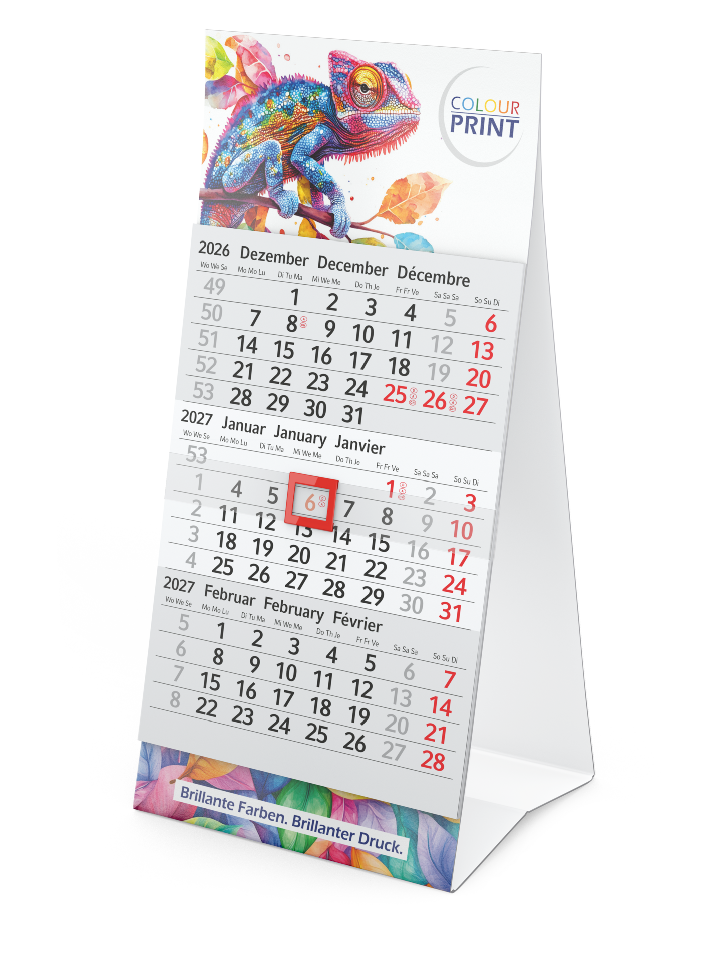 Der Mini 3 ist ein kompakter und kostengünstiger Tisch-Aufstellkalender, der Übersicht und Werbewirkung perfekt kombiniert. Das dreisprachige Kalendarium (Deutsch/Englisch/Französisch) bietet drei Monate auf einen Blick, mit Sonn- und Feiertagen, die farbig hervorgehoben sind. Der rote Datumsschieber erleichtert die Navigation, während die Werbeflächen – einschließlich einer komplett bedruckbaren Rückseite – viel Platz für individuelle Gestaltung bieten. Dank Offset- und Druckoptionen ist der Mini 3 besonders flexibel anpassbar. „Made in Germany“ – funktional, effizient und hochwertig.