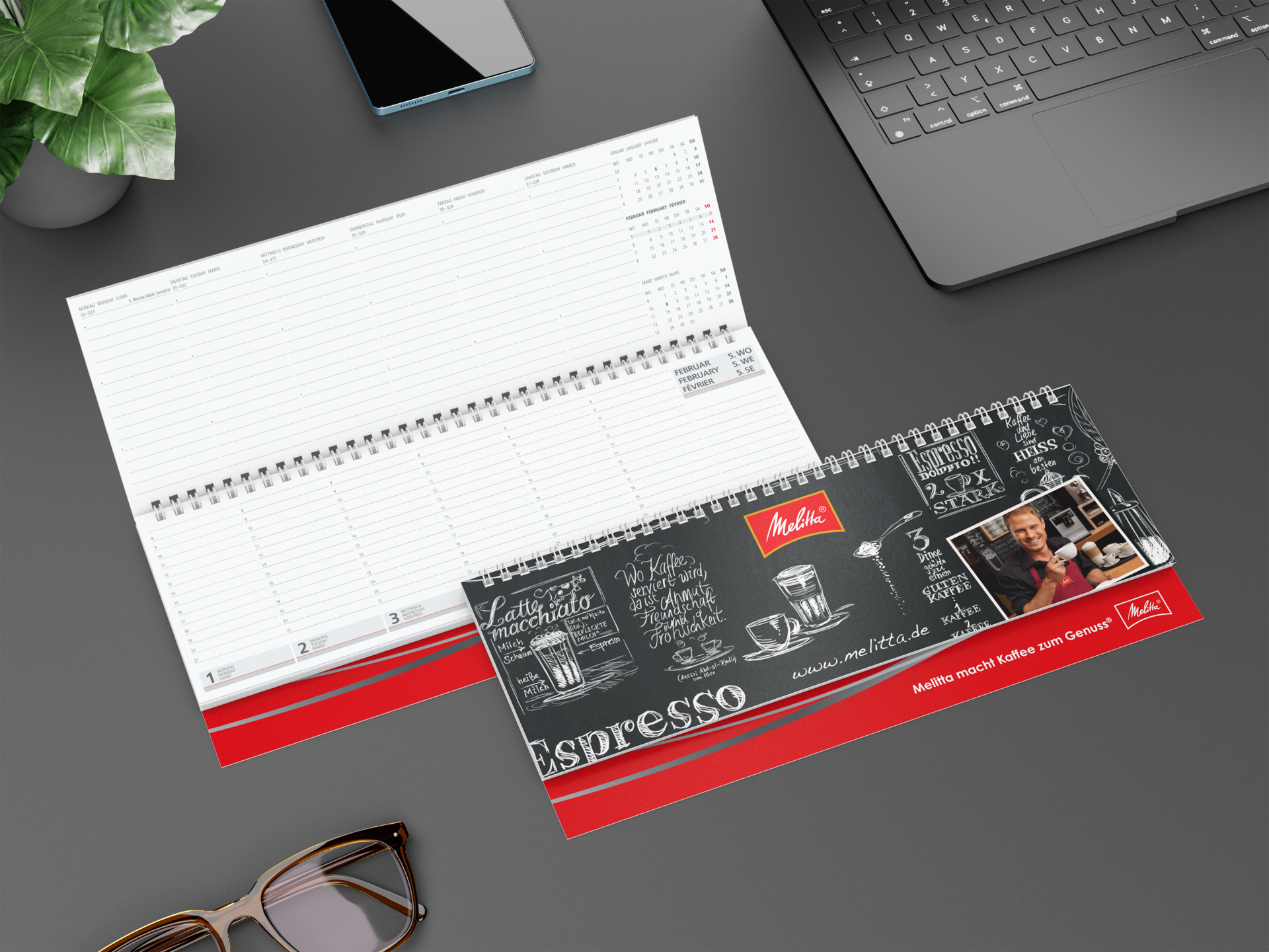 Der Tisch-Querkalender Ideal ist der Inbegriff von Funktionalität und Flexibilität. Mit seinem klaren Design und den zahlreichen Veredelungsoptionen ist er ein zuverlässiges und individuelles Werbemittel für Unternehmen.