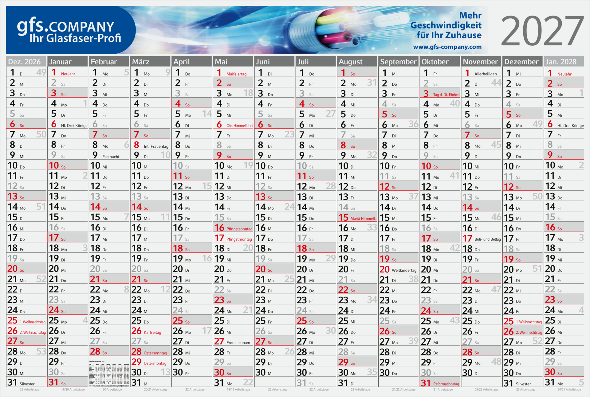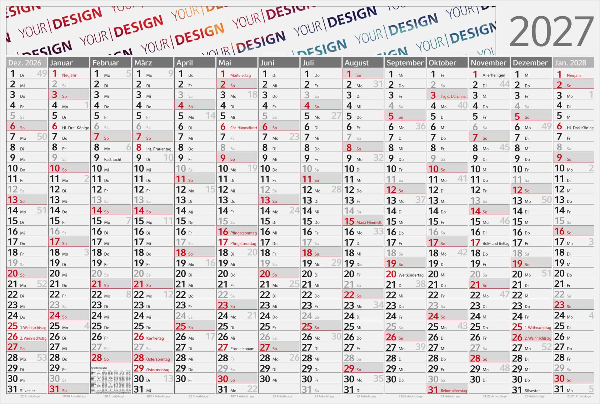 Der Wandplaner Pure Bamboo green+blue bietet eine nachhaltige Lösung für langfristige Planung im Büro oder Betrieb. Gefertigt aus schnell nachwachsenden Rohstoffen – einer Kombination aus Bambus- und Baumwollpapier – überzeugt er durch Umweltbewusstsein und hohe Verarbeitungsqualität. Das großzügige Format von 980 × 660 mm bietet ausreichend Platz für eine klare Monatsübersicht über 14 Monate hinweg – von Dezember im Vorjahr bis Januar im Folgejahr. Die farbige Hervorhebung von Sonn- und Feiertagen erleichtert die Orientierung. Der einsprachige Kalender ist auf Deutsch gehalten, die Jahreszahl ist dezent in Anthrazit dargestellt. Inklusive ist ein hochwertiger 4C-Druck (CMYK), der auf der Werbefläche am oberen Rand neben der Jahreszahl für individuelle Gestaltung genutzt werden kann.