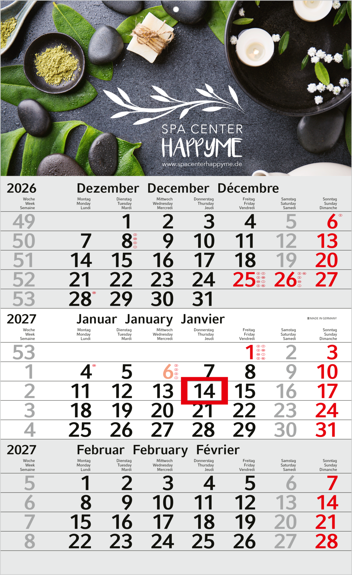 Der Budget 3 x.press ist die schnelle Lösung für hochwertige Werbekalender. Mit einer Produktionszeit von nur 3 Arbeitstagen, moderner Typografie und einem praktischen 3-Monatskalendarium erfüllt er die Anforderungen von Unternehmen, die auf Funktionalität, Design und Geschwindigkeit setzen. Die großzügige Werbefläche ist individuell bedruckbar, während das klare Kalendarium mit roten Akzenten eine ideale Übersicht gewährleistet.